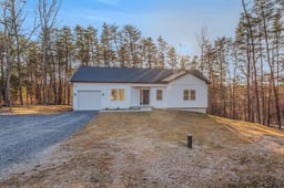 This custom-built residence boasts over 1,200 square feet of finished living space, offering an ideal blend of functionality and luxury. The open floor plan features a cathedral ceiling in the kitchen, dining, and living areas, complemented by luxury vinyl plank flooring throughout. Additional amenities include 9-foot ceilings, ceiling fans, wood shelving in closets, and heating and air returns in each room. The property comprises 3 bedrooms, including a primary bedroom with an attached bathroom, walk-in closet, as well as a 5-foot walk-in shower. Two full baths. The kitchen is equipped with quartz countertops and stainless steel appliances, and a dining area leads out to the rear deck. An attached garage opens into the laundry room/mud room, which includes cabinets, quartz countertops, and a sink. The property also features a full, unfinished walk-out basement with rough-in plumbing for a potential third bathroom. There is amble room to finish the basement for additional living space or it makes a great storage area. Built with 2x6 exterior walls for enhanced energy efficiency, this home is situated on two lots totaling 1.91 acres, accessible via a sidewalk leading to the covered front porch.
