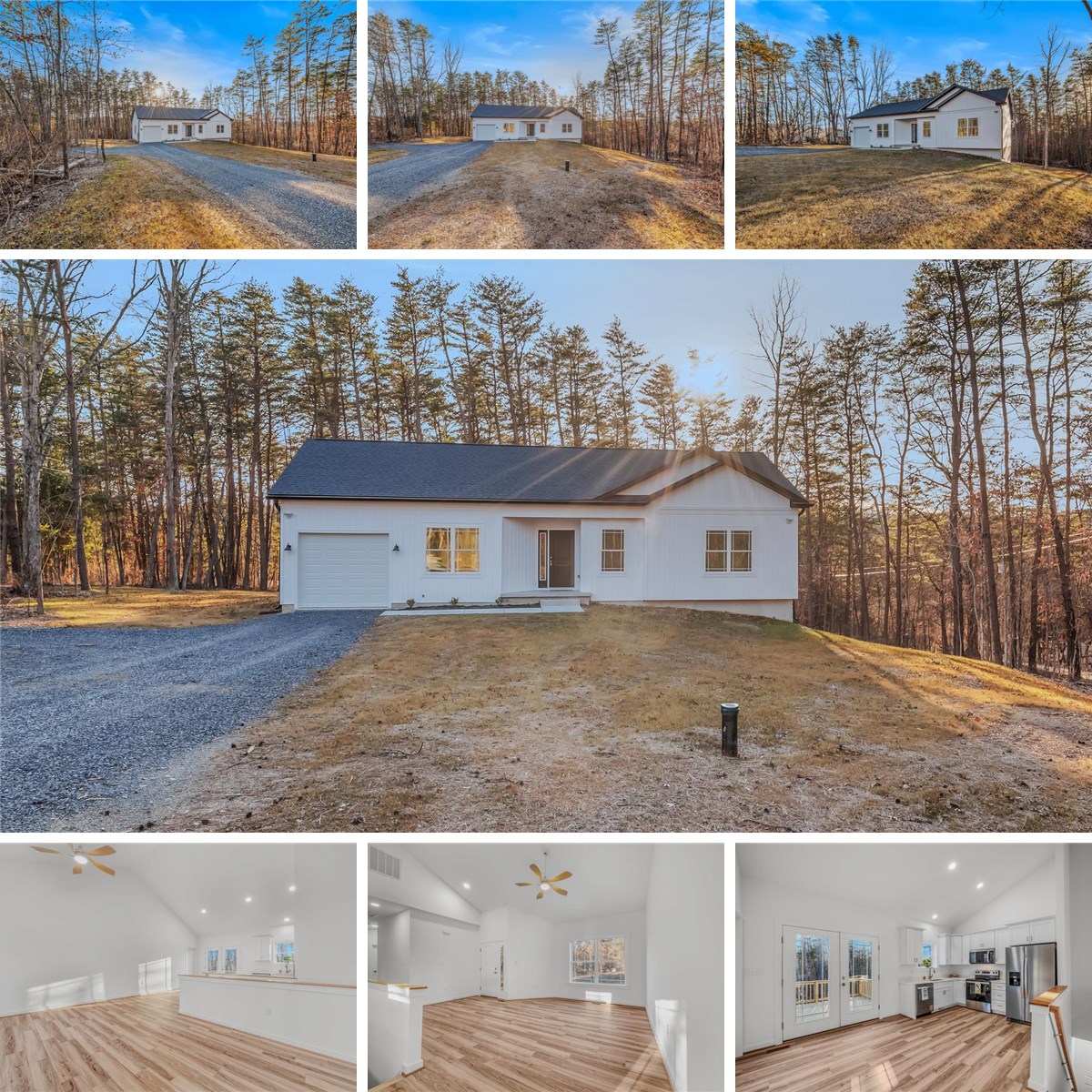 This custom-built residence boasts over 1,200 square feet of finished living space, offering an ideal blend of functionality and luxury. The open floor plan features a cathedral ceiling in the kitchen, dining, and living areas, complemented by luxury vinyl plank flooring throughout. Additional amenities include 9-foot ceilings, ceiling fans, wood shelving in closets, and heating and air returns in each room. The property comprises 3 bedrooms, including a primary bedroom with an attached bathroom, walk-in closet, as well as a 5-foot walk-in shower. Two full baths. The kitchen is equipped with quartz countertops and stainless steel appliances, and a dining area leads out to the rear deck. An attached garage opens into the laundry room/mud room, which includes cabinets, quartz countertops, and a sink. The property also features a full, unfinished walk-out basement with rough-in plumbing for a potential third bathroom. There is amble room to finish the basement for additional living space or it makes a great storage area. Built with 2x6 exterior walls for enhanced energy efficiency, this home is situated on two lots totaling 1.91 acres, accessible via a sidewalk leading to the covered front porch.